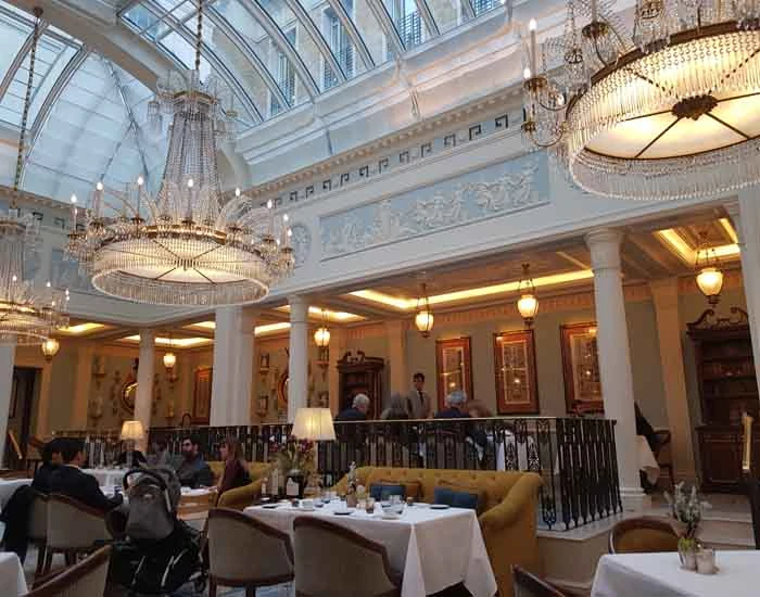 Afternoon tea at the Lanesborough is served in the Celest Restaurant. The restaurant has a regency grandeur...high ceilings white columns spectacular crystal chandeliers and more...
