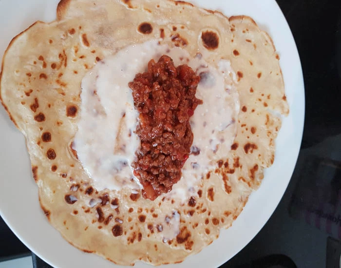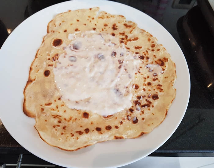 Take a pancake and add a teaspoon of bechamel sauce and spread onto the pancake. Take one heaped tablespoon of mincemeat place it onto the centre of the pancake.