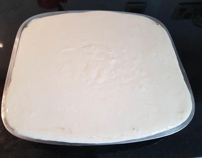 Simmer for 15 minutes on low heat. Line your roasting dish or tin with the tomato sauce. Add 4 tablespoons of bechamel sauce to the tomato sauce and mix in.