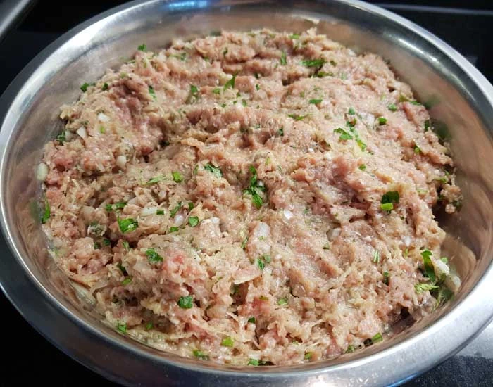 In a large bowl add the pork mince, grated potatoes, dried mint, ground cinnamon, salt and pepper, chopped parsley and chopped onion. Mix together using your hands until all the ingredients are well mixed and blended together. Add the eggs and mix, finally, add the breadcrumbs and mix, cover the bowl with cling film, foil or a towel for 30 mins.